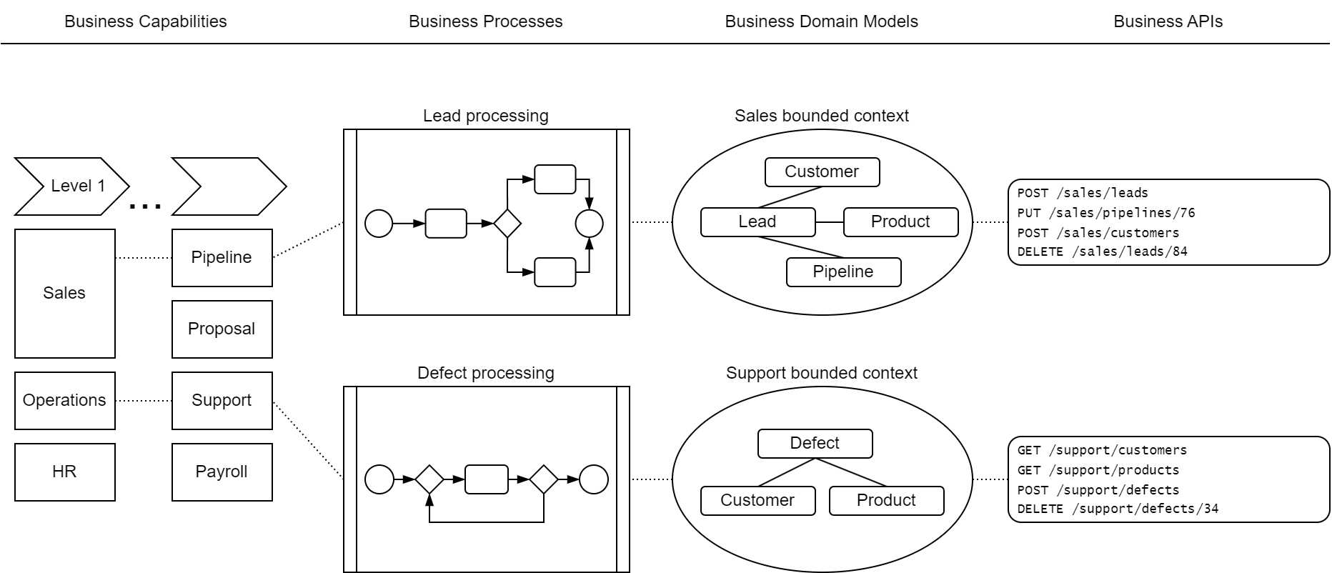 There is continuity between business capability models and API design. Domain Driven Design is a powerful methodology to deliver the right product incrementally, including APIs.